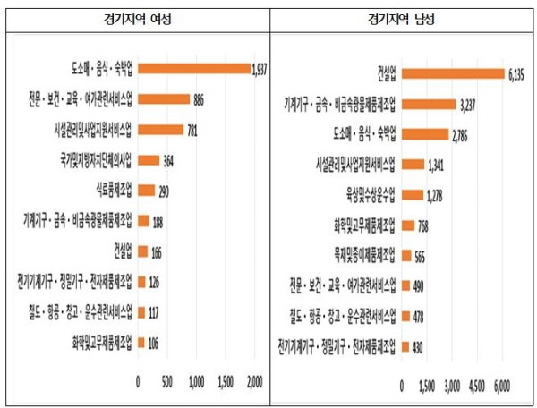 보고서에 따르면 2020년 경기도 산업재해자 2만7,635명 중 여성은 5,969명(전체 21.6%), 남성은 2만1,666명이다. 성별 산업재해 업종 비율을 보면 여성은 ▲도소매‧음식‧숙박업(35.4%) ▲보건‧교육 등(17.5%) ▲시설관리 및 지원서비스업(13.6%) 등의 순이고, 남성은 ▲건설업(30.5%) ▲기계기구‧비금속‧금속제품 제조업(17.4%) ▲도소매‧음식‧숙박업(14.2%) 등의 순이다.