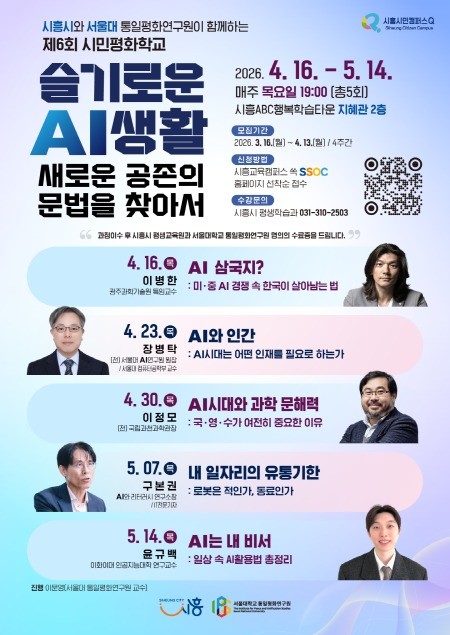 김상동 평생교육원장은 “인공지능이 일상의 문법을 바꾸고 있는 지금, 시민들이 막연한 두려움을 버리고 미래를 주도적으로 설계할 수 있도록 이번 프로그램을 준비했다”라며 “국내 최고 수준의 석학들과 소통하며 인공지능 시대의 새로운 평화와 공존의 길을 찾는 소중한 시간이 되길 바란다”라고 말했다.