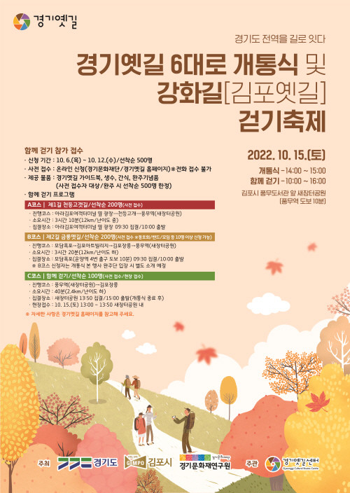 경기도와 경기문화재단(경기옛길센터)은 오는 15일 오후 2시 김포시 새장터 공원에서 이런 내용을 담은 ‘경기옛길 6대로 개통식’을 열고 본격적인 경기옛길 알리기에 나선다.