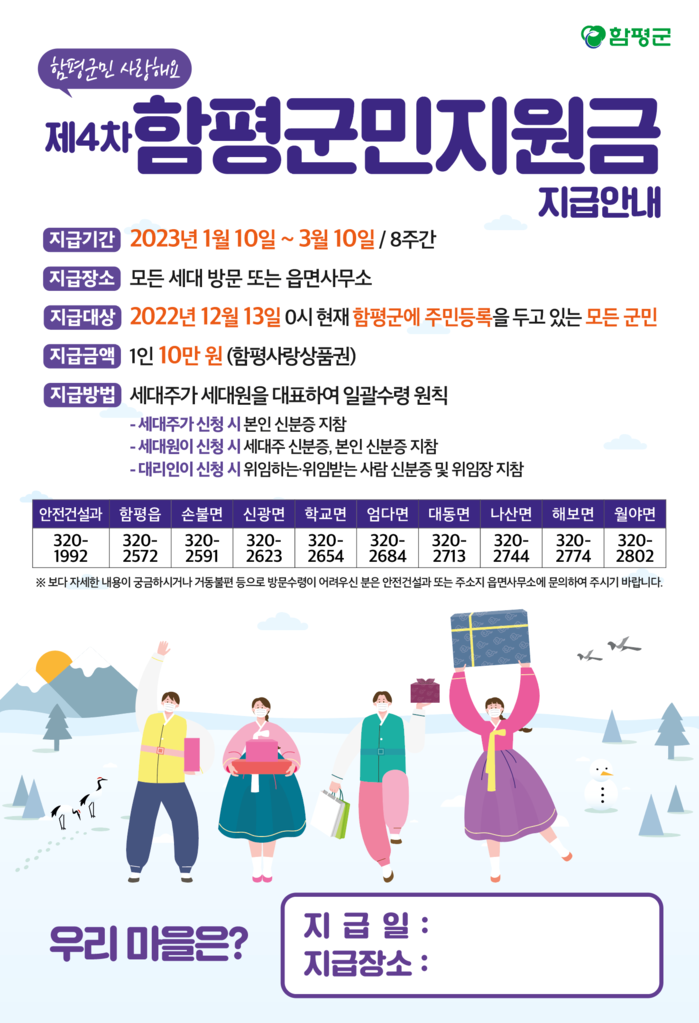 지급대상은 2022년 12월 13일 기준 함평군에 주소를 둔 군민이며, 지급기간은 2023년 1월 10일부터 3월 10일까지 8주간이다.