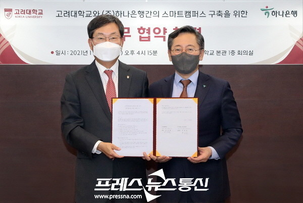 [프레스뉴스] 강보선 기자= 하나은행(은행장 박성호)은 고려대학교(총장 정진택)와 고려대학교 서울캠퍼스에서 고려대학교 스마트 캠퍼스 구축을 위한 업무협약을 체결했다고 밝혔다.