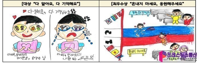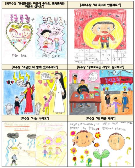 대상에는 ‘다 알아요, 다 기억해요’, 최우수상에는 ‘혼내지 마세요, 응원해 주세요’, ‘동글동글한 마음이 좋아요, 뾰족뾰족한 마음은 싫어요’, ‘내 목소리 안 들려요?’라는 제목의 그림과 포스터가 선정됐다.