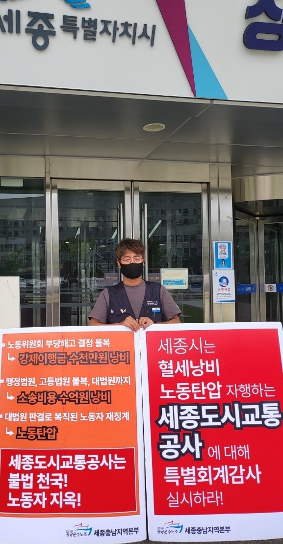 [프레스뉴스] 김교연 기자= 세종도시교통공사(이하‘공사’)로부터 부당 징계를 받은 박근태 공공운수노조 세종도시교통공사분회 前 분회장이 시 감사를 요구하며 시청 앞에서 1인 시위를 이어 가고 있어 이목이 집중되고 있다.