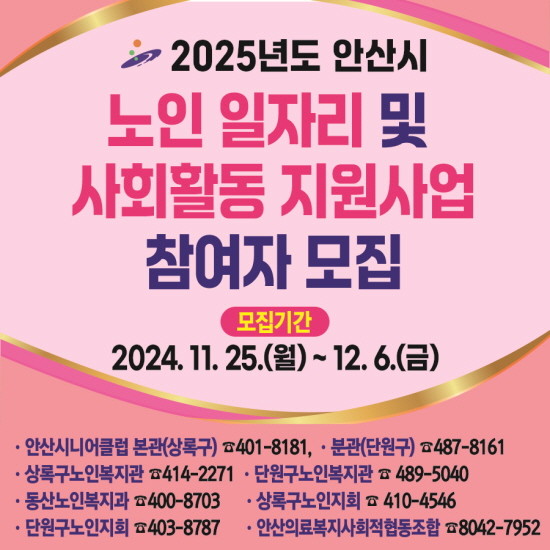 [프레스뉴스] 장현준 기자= 안산시(시장 이민근)는 오는 25일부터 다음 달 6일까지 ‘2025년 노인일자리 및 사회활동 지원사업’ 참여자 6천387명을 모집한다고 22일 밝혔다.