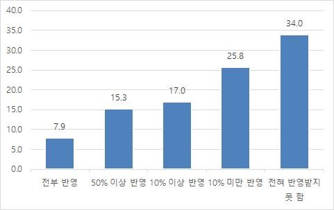 조사 대상 233개 기업 가운데 원자재 가격 상승분이 납품단가에 모두 반영된 곳은 7.9%(18개 사)에 불과했으며 34%(77개 사)는 납품단가를 전혀 올리지 못한 것으로 조사됐다.