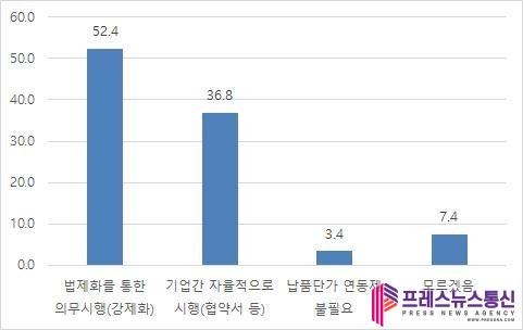 납품단가 연동제 방식으로는 법제화를 통한 의무 시행(52.4%)과 기업 간 자율적 시행(36.8%)이 주로 지목됐다. 연동제 대상으로는 제품을 만들 때 납품단가의 일정 비율을 차지하는 원자재(43.3%)와 모든 원자재(41.6%)를 대부분 언급했다.