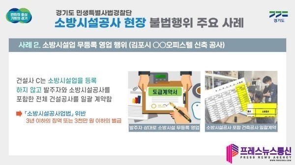 주요 사례를 보면 화성시 소재 복합건축물 신축공사현장 발주자 ‘A’는 소방시설공사업자가 아닌 종합건설사 ‘B’에게 소방공사를 포함한 건축공사 전체를 150억 원에 도급계약해 소방시설공사 도급위반과 분리도급 위반으로 적발됐다.