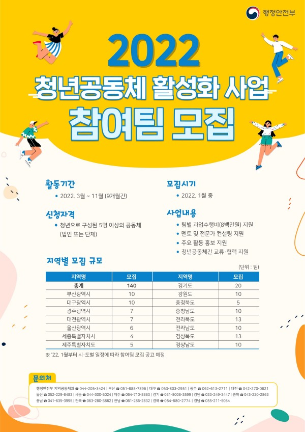 경기도 관계자는 “코로나19 장기화로 침체한 지역의 활력을 불어넣을 수 있도록 청년들이 많은 관심을 두고 참여해 주길 바라며, 경기도에서도 공동체 활성화를 위해 적극 지원하겠다”고 말했다.