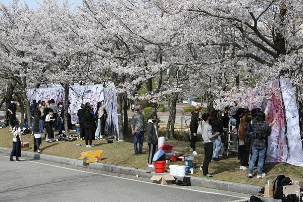 학생들은 교정 내 만개한 벚꽃과 어우러진 풍경을 나무와 나무 사이에 걸은 천(가로 7m, 세로 2m)에 담았다.