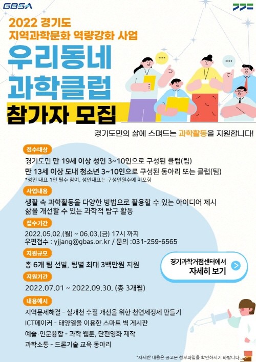 이 사업은 과학기술정보통신부에서 지역과학문화 생태계 구축을 위해 추진하는 ‘지역과학문화 역량강화 사업’의 하나로 경기도는 도내 과학 동아리 6개 팀을 선발할 계획이다. 최종 선발된 동아리는 7월부터 3개월 동안 사업을 수행하고 최대 300만 원의 지원금을 받을 수 있다.
