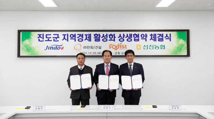 진도군은 지난 20일 선진농협과 ㈜한화건설, ㈜푸디스트와 지역 농산물 납품 등 지역경제활성화 상생 협약을 맺은 바 있으며, 내년 1월부터 한달에 1,000가마(20kg 기준) 쌀 20톤 등 연간 5억원 상당의 농산물 납품을 시작한다.