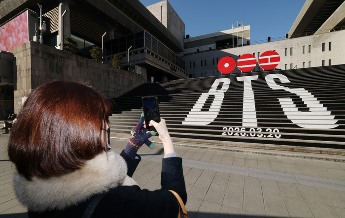 | ▲6일 오전 서울 종로구 세종문화회관 야외 계단에 설치된 BTS(방탄소년단)의 컴백 로고 조형물 앞에서 관광객이 기념촬영을 하고 있다./사진-뉴스1 |