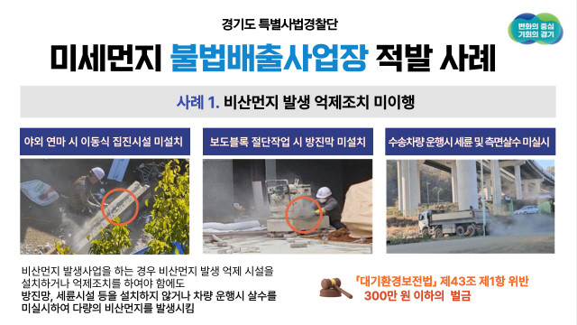 안양시 소재 C업체는 공사장의 벽면을 연마하는 과정에서 다량의 비산먼지가 발생하는데도 전동연마기에 이동식 방진망을 설치하지 않는 등 비산먼지 발생 억제조치를 하지 않고 작업하다 적발됐다. 부천시 소재 D업체도 건축물 축조공사로 야외에서 보도블록을 절단하면서 방진망 등 억제시설을 설치하지 않고 작업하며 비산먼지를 날리다 적발됐다.
