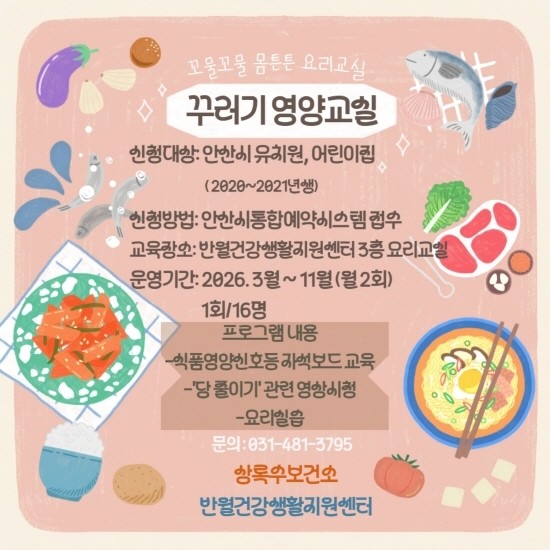 [프레스뉴스] 장현준 기자= 안산시(시장 이민근) 상록수보건소 반월건강생활지원센터는 오는 3월부터 11월까지 관내 6~7세 아동을 대상으로 ‘꾸러기 영양교실’을 운영한다고 30일 밝혔다.