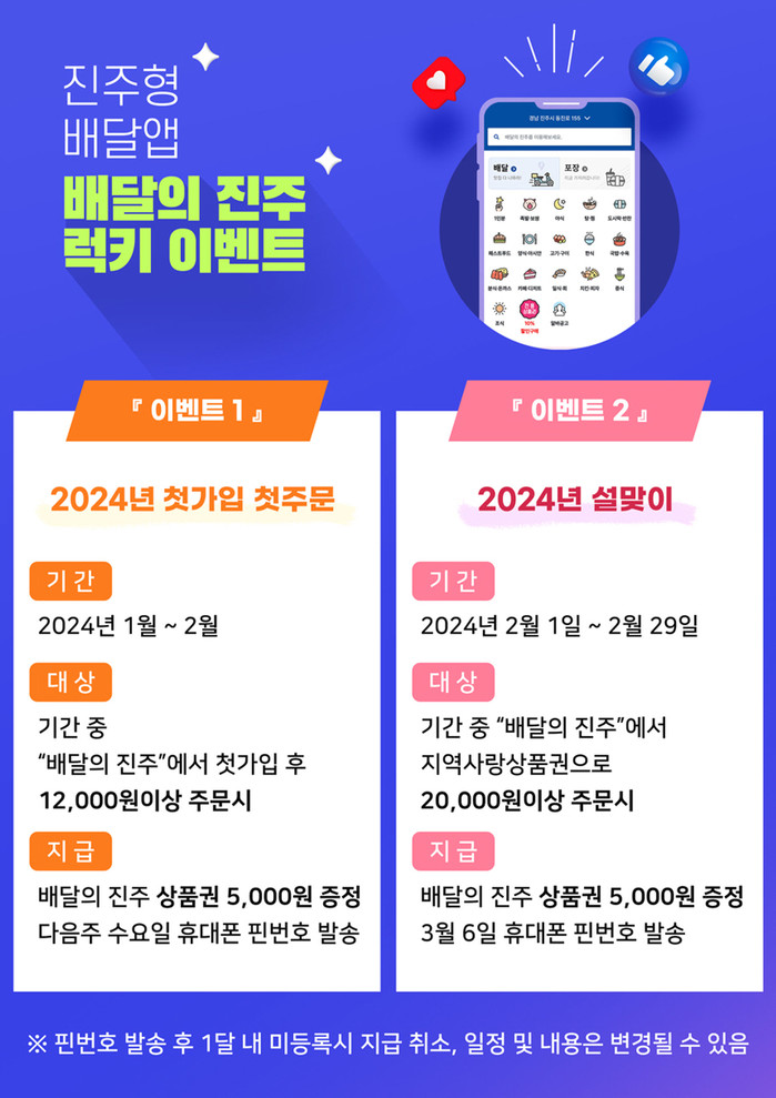 진주형 공공배달앱 ‘배달의 진주’는 설을 맞아 2월 한 달 동안 2만 원 이상 결제 시 5000원 배달앱 상품권을 3월 6일에 증정하는 이벤트를 진행한다.