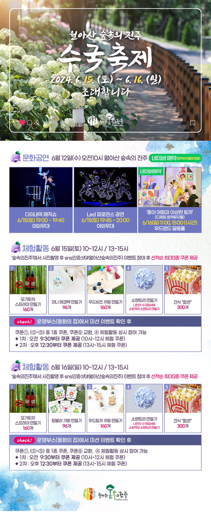 이번 수국축제에서는 20일부터 23일까지 4일간 개최되는 ‘제2회 월아산 정원박람회’의 참여 분위기를 확산하고 기대감을 높이기 위해 다양한 문화공연과 체험행사가 진행된다.