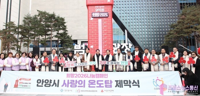 [프레스뉴스] 장현준 기자= 안양시는 지난 4일 범계역 광장에서 ‘희망 2026 나눔 캠페인 사랑의 온도탑’ 제막식을 열고, 모금 목표 9억원을 향한 연말 이웃돕기 캠페인의 막을 올렸다고 5일 밝혔다.