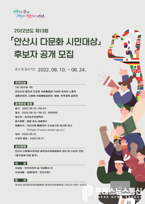 [프레스뉴스] 장현준 기자= 안산시(시장 이민근)는 제13회 ‘안산시 다문화시민대상’ 후보자를 공개모집 한다고 12일 밝혔다.
