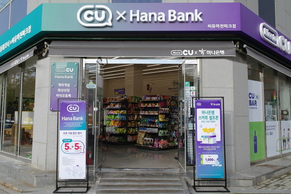 | ▲양사의 BI와 CI를 내·외부 인테리어에 공통으로 적용한 디지털 혁신 채널 'CU마천파크점' 외관(사진=하나은행) |