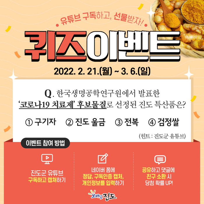 SNS 인증샷 이벤트는 최근 한국생명공학연구원에서 발표한 코로나19 치료제 후보 물질로 선정된 진도 특산품인 정답을 진도군 유튜브를 구독하고 인증하면 된다.