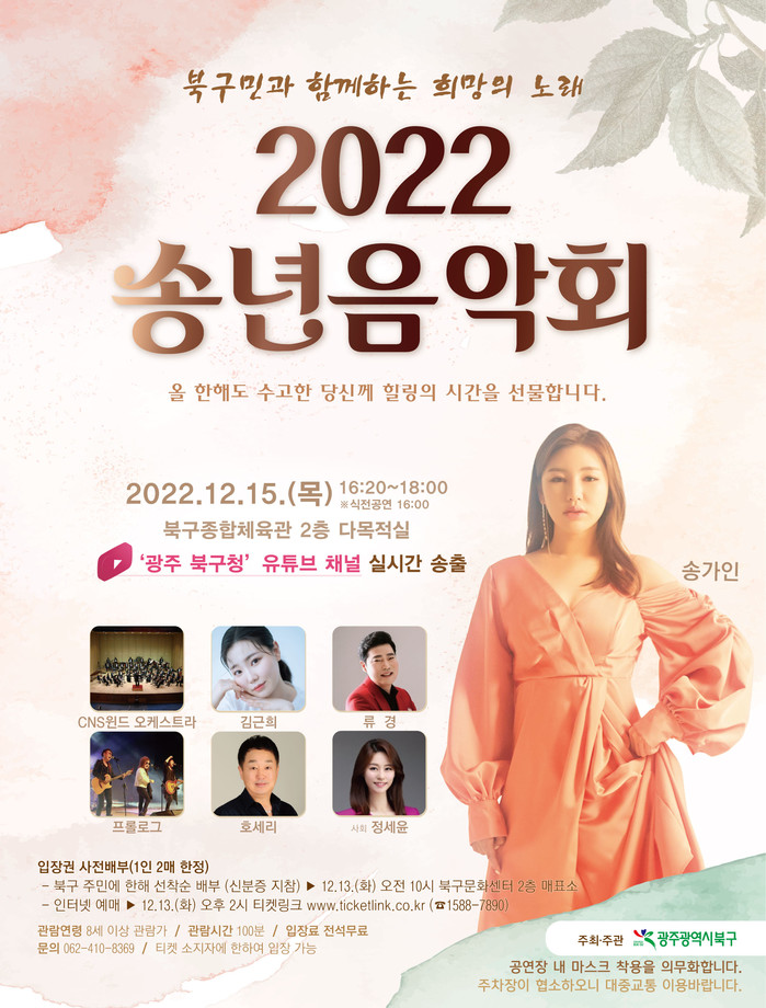 [광주=프레스뉴스] 강래성 기자= 광주시 북구(구청장 문인)는 오는 15일 오후 4시 북구종합체육관 2층 다목적실에서 ‘북구민과 함께하는 2022년 송년음악회’를 개최한다고 12일 밝혔다.