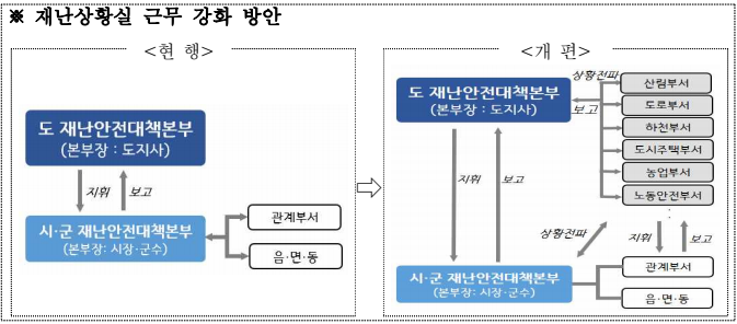 우선 도는 재난상황 관리체계를 즉시 개편한다. 그간 시설별 사전점검은 소관부서에서 수행하고, 비상시 재난안전대책본부를 중심으로 재난상황실에서 대처했었다. 그러나 갑작스러운 재난 상황에는 신속한 현황 파악이 어려워 적시 통제 및 대처에 한계가 있다고 인식했다. 이에 도로, 하천, 건설현장, 산림, 농업, 주택분야 등 분야별로 재난안전대책본부와 실시간 재난정보를 공유할 수 있는 관련 부서 자체상황실을 실무반으로 편성·운영해 신속한 대응을 강화할 방침이다.