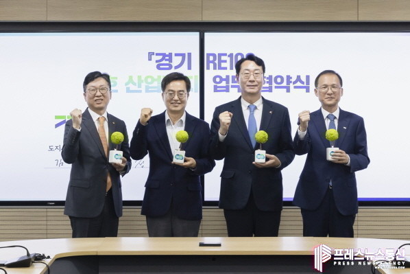 | ▲ 지난 15일 오후 경기도청 서희홀에서 열린 경기 RE100 1호 산업단지 업무 협약식에서 김동연 경기도지사 (왼쪽부터) 신동진 한화솔루션 인사이트부문 부문장,정명근 화성시장, 김근영 화성도시공사 사장이 기념촬영을 하고 있다.(사진=경기도) |