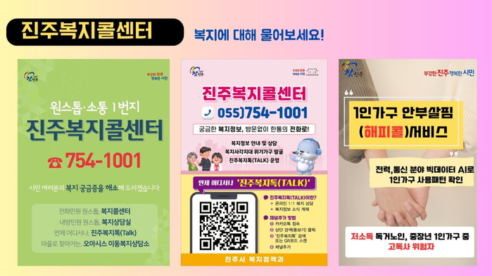 진주복지콜센터에서는 외부와 교류가 적은 독거노인, 고독사 위험군인 중장년층 등의 1인 가구 40명에게 주 1회 전화를 걸어 안전을 살피며 말벗이 되어주고 희망 메시지를 전하는 ‘희망안부콜 서비스’를 시행하고 있다.