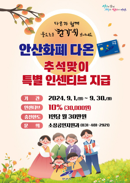 [프레스뉴스] 장현준 기자= 안산시(시장 이민근)는 추석 명절을 맞아 9월 한 달 동안 안산 지역화폐 다온의 ‘특별 인센티브’를 지급한다고 31일 밝혔다.
