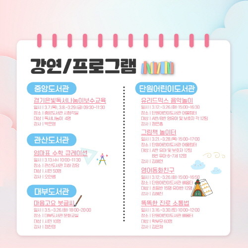 새 학기 학부모를 위한 강연 ▲엄마표 수학 큐레이션[관산도서관 3/13(수) 오전10시]과 ▲똑똑한 진로 소통법[단원어린이도서관 3/16~30(매주 토), 오전10시]을 실시해 자녀 양육의 기술과 학생들의 진로 역량에 도움을 주고자 한다.