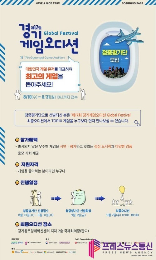 [프레스뉴스] 장현준 기자= 경기도가 국내 게임 기업의 세계시장 진출 지원을 위한 제17회 경기게임 오디션 글로벌 부문(이하 ‘오디션’) 최종 우승팀 선발에 참여할 청중평가단을 오는 31일까지 모집한다.