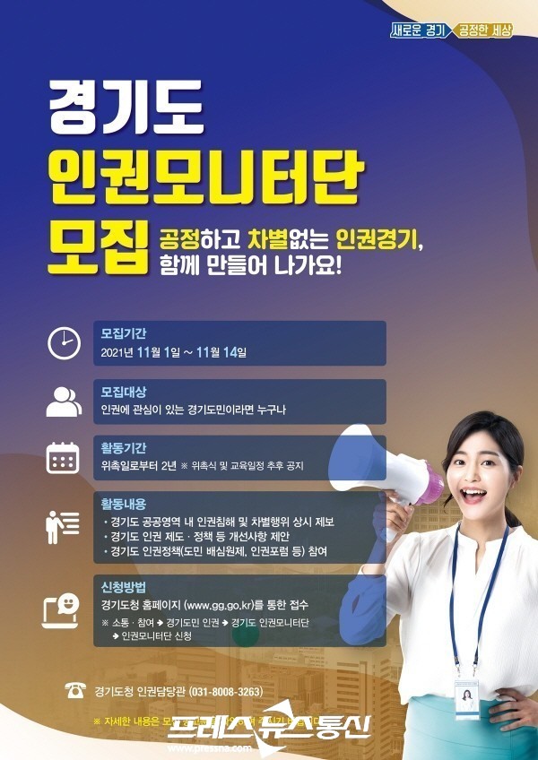 [프레스뉴스] 강보선 기자= 경기도가 인권친화적 경기행정을 구현하기 위해 ‘제2기 경기도민 인권모니터단’을 기존 30명에서 1천 명으로 대폭 확대하기로 하고, 도민 666명을 공개 모집한다.