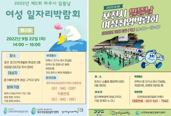| ▲ 2022년 제2회 파주시 일뜰날 여성 일자리박람회, 2022년 제3회 포천시 일뜰날 여성 취업박람회 포스터(사진=경기도일자리재단) |