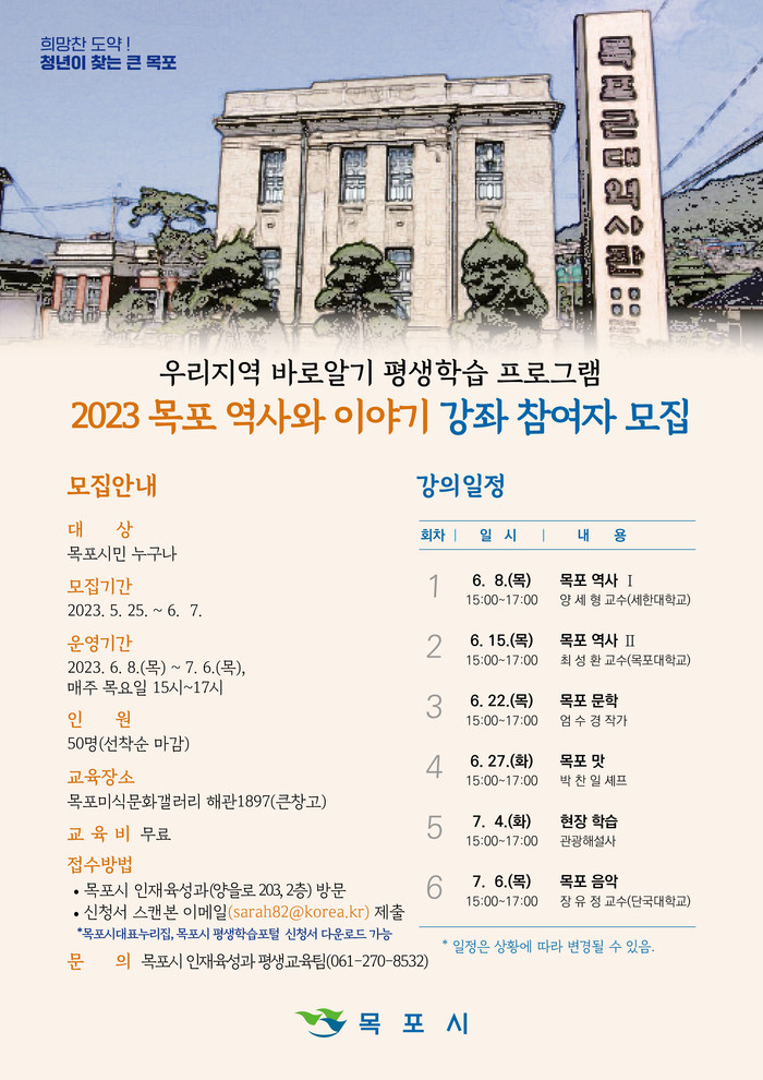 [전남=프레스뉴스] 이광남 기자= 전남 목포시가 우리지역 바로알기 평생학습 프로그램으로 ‘목포 역사와 이야기’ 강좌를 오는 6월 8일부터 시작한다.