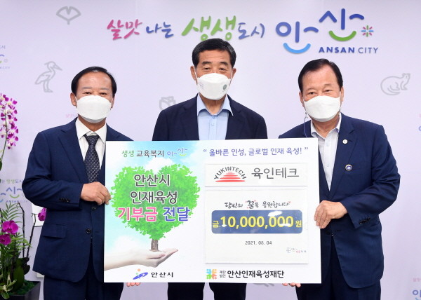 이날 시청에서 진행된 전달식에는 윤화섭 시장과 김봉식 (재)안산인재육성재단 대표이사, ㈜육인테크 조갑훈 대표가 참석했다.