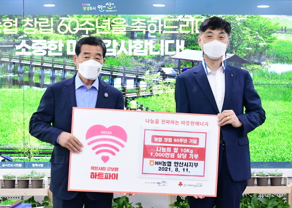NH농협은행 안산시지부는 지역농협의 공동이익 증진을 위한 지도·경제·신용사업을 추진 중인 금융기관으로 올해 2월에 쌀 ‘천사(1천4)’포를 기탁하는 등 지속적인 나눔 활동을 실천하고 있다.