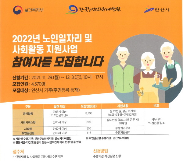 [프레스뉴스] 강보선 기자= 안산시(시장 윤화섭)는 ‘2022년 노인일자리 및 사회활동 지원사업’ 참여자 4천570명을 다음달 3일 오후 5시까지 모집한다고 29일 밝혔다.
