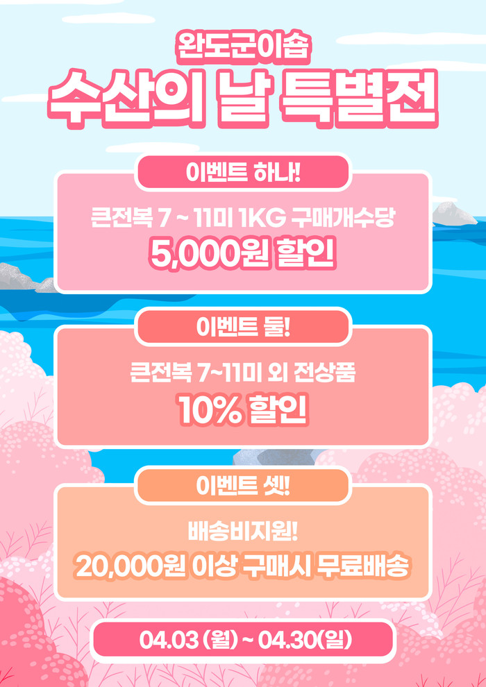 특별전는 4월 3일부터 4월 30일까지 진행되며, 완도군 온라인 쇼핑몰인 ‘완도군이숍’ 기획관에서 큰 전복(7~11미, 1kg)을 구입 시 건당 5000원 할인쿠폰과 20,000원 이상 상품을 구매하면 무료 배송 이벤트를 선착순으로 진행한다.