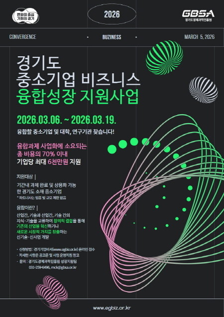 [프레스뉴스] 강보선 기자= 경기도와 (재)경기도경제과학진흥원(이하 경과원)이 도내 중소기업의 혁신 성장과 새로운 비즈니스 모델 발굴을 돕는 ‘2026년 중소기업 비즈니스 융합성장 지원사업’의 참여기업을 모집한다.