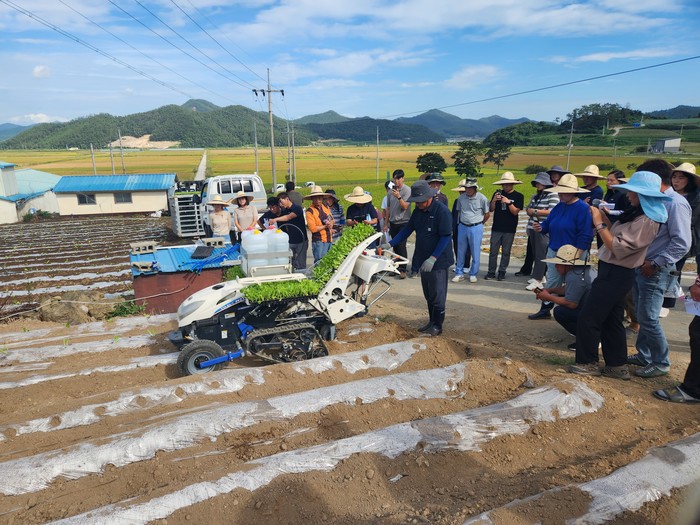지산면 앵무리 일원에서 열린 시연회에는 공동연구기관인 한국농수산대학, 전남농업기술원, 진도군농업기술센터, 현대농기계, 에이치엠에스, 진도큰집 등의 관계자와 농업인 50여 명이 참여했다.