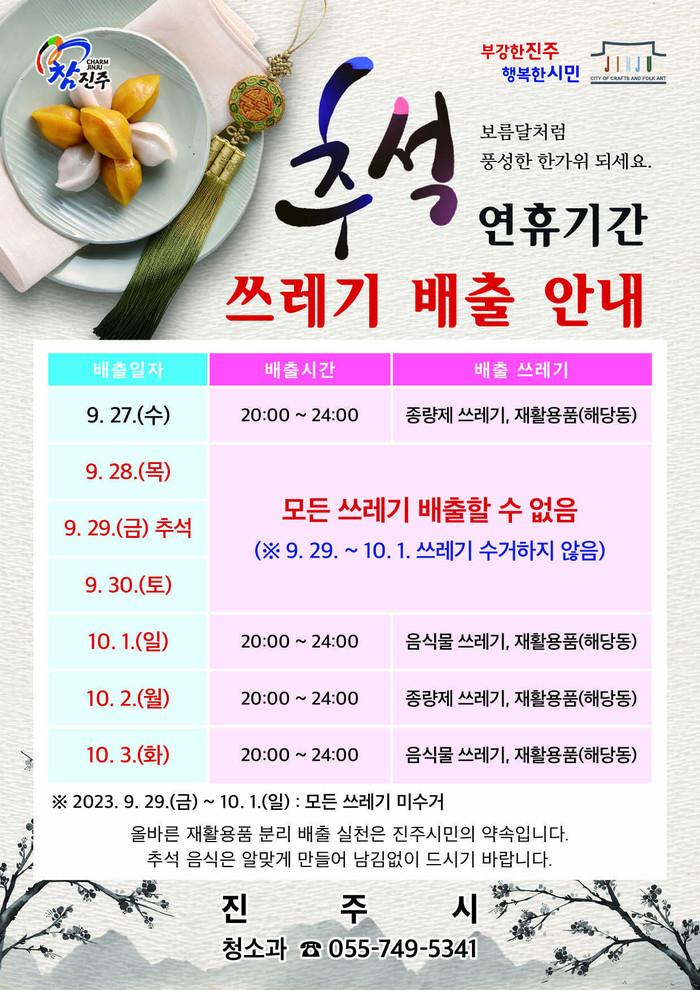 특히, 추석당일인 29일부터 10월 1일까지 사흘간은 모든 종류의 쓰레기를 수거하지 않는다. 이에 따라 쓰레기 배출일을 잘 지켜 쾌적한 추석연휴를 보낼 수 있도록 주의를 당부했다.