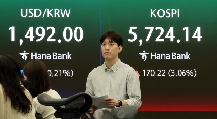 | ▲25일 서울 중구 하나은행 딜링룸 전광판에 증시 시황이 표시되고 있다. 이날 코스피는 전 거래일 대비 170.22포인트(3.06%) 오른 5724.14를 기록하고 있다./사진-뉴스1 |