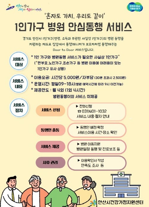 안산시에 따르면, 1인 가구 병원 안심동행 서비스는 요양보호사 등의 자격을 가진 전문 인력이 병원 이동부터 접수 및 수납과 진료 후 귀가까지 도와주는 서비스다.