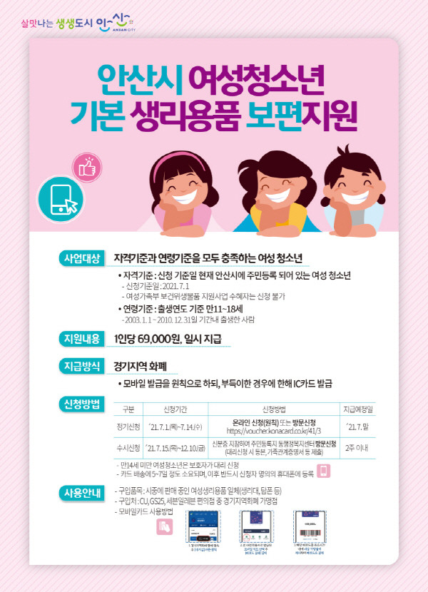 지원 대상은 이날 또는 신청일 안산시 주민등록 된 만 11~18세 여성청소년(2003년~2010년 출생)이며, 여성가족부 보건위생물품 지원을 받고 있다면 중복지원은 불가하다.