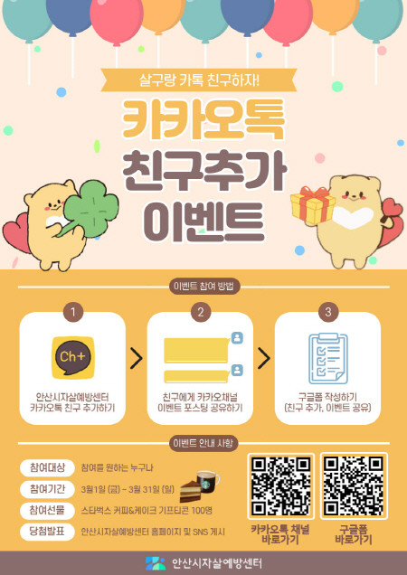 [프레스뉴스] 장현준 기자= 안산시(시장 이민근) 자살예방센터는 3월 한 달간 ‘카카오톡 친구 추가 이벤트’를 시행한다고 29일 밝혔다.