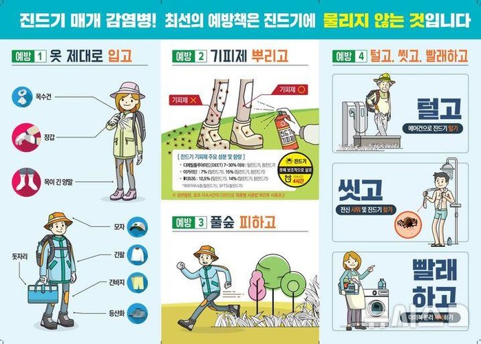 또한 작업 전 진드기 기피제 뿌리기, 풀밭에 앉을 때 돗자리 사용, 작업 후 작업복 분리 세탁 및 바로 샤워하기 등을 실천해야 한다.