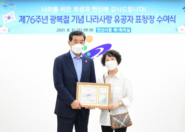 [프레스뉴스] 강보선 기자= 윤화섭 안산시장은 11일 제76주년 광복절을 기념해 독립유공자 고(故) 손태준(1911~1950) 선생의 딸 손화자 씨에게 ‘나라사랑 유공자 표창장’을 수여했다.
