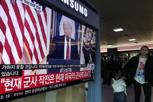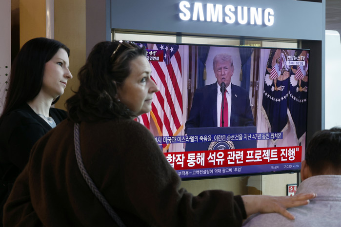 | ▲2일 오전 서울시 용산구 서울역 대합실에서 외국인 관광객들이 도널드 트럼프 미국 대통령의 이란 전쟁 상황 관련 대국민 연설 TV 생중계를 지켜보고 있다. /사진=뉴스1 |