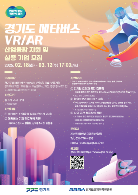 [프레스뉴스] 장현준 기자= 경기도와 경제과학진흥원(이하 경과원)은 메타버스(VR/AR)와 기존 산업 간 융합을 통한 혁신적인 성과 창출을 목표로 ‘2025년 메타버스 산업융합 지원 및 실증’ 사업에 참여할 기업을 다음 달 12일까지 공개 모집한다.