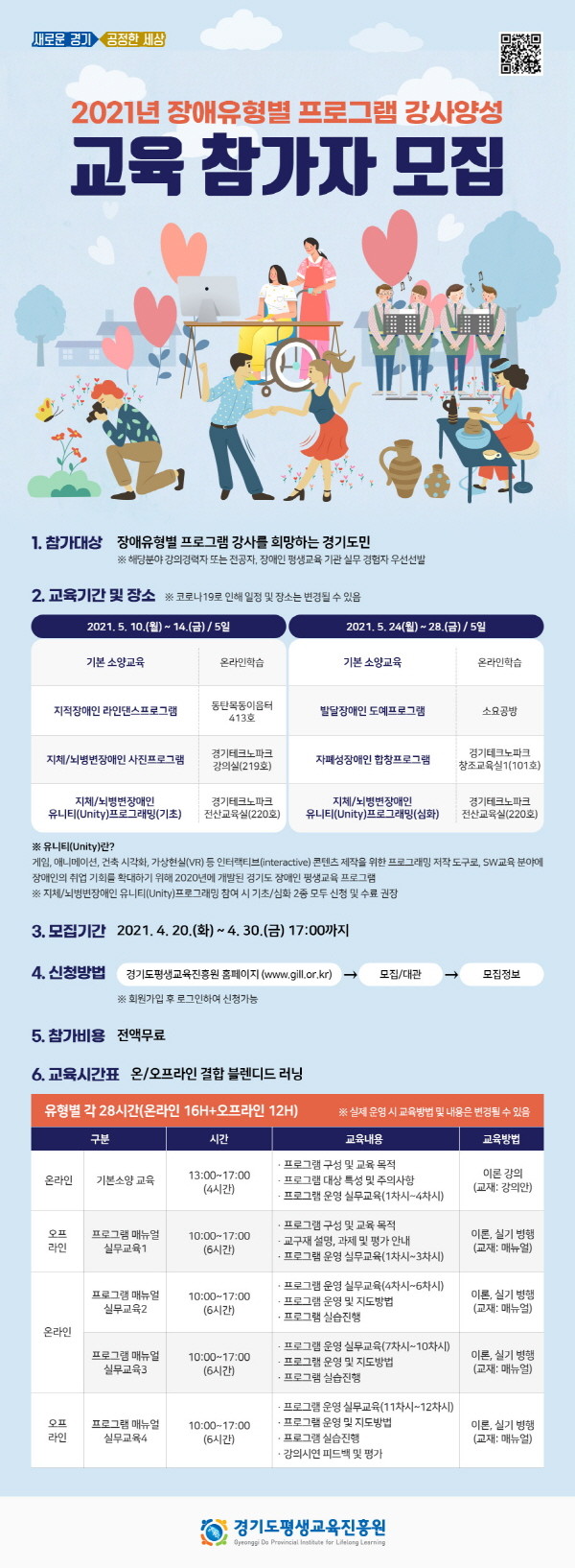 프로그램별 전문 강사가 되기를 희망하는 경기도민은 신청할 수 있으며, 해당 분야 강의경력자, 전공자, 장애인 평생교육 기관 실무자는 우선 선발한다. 교육비는 전액 무료다.